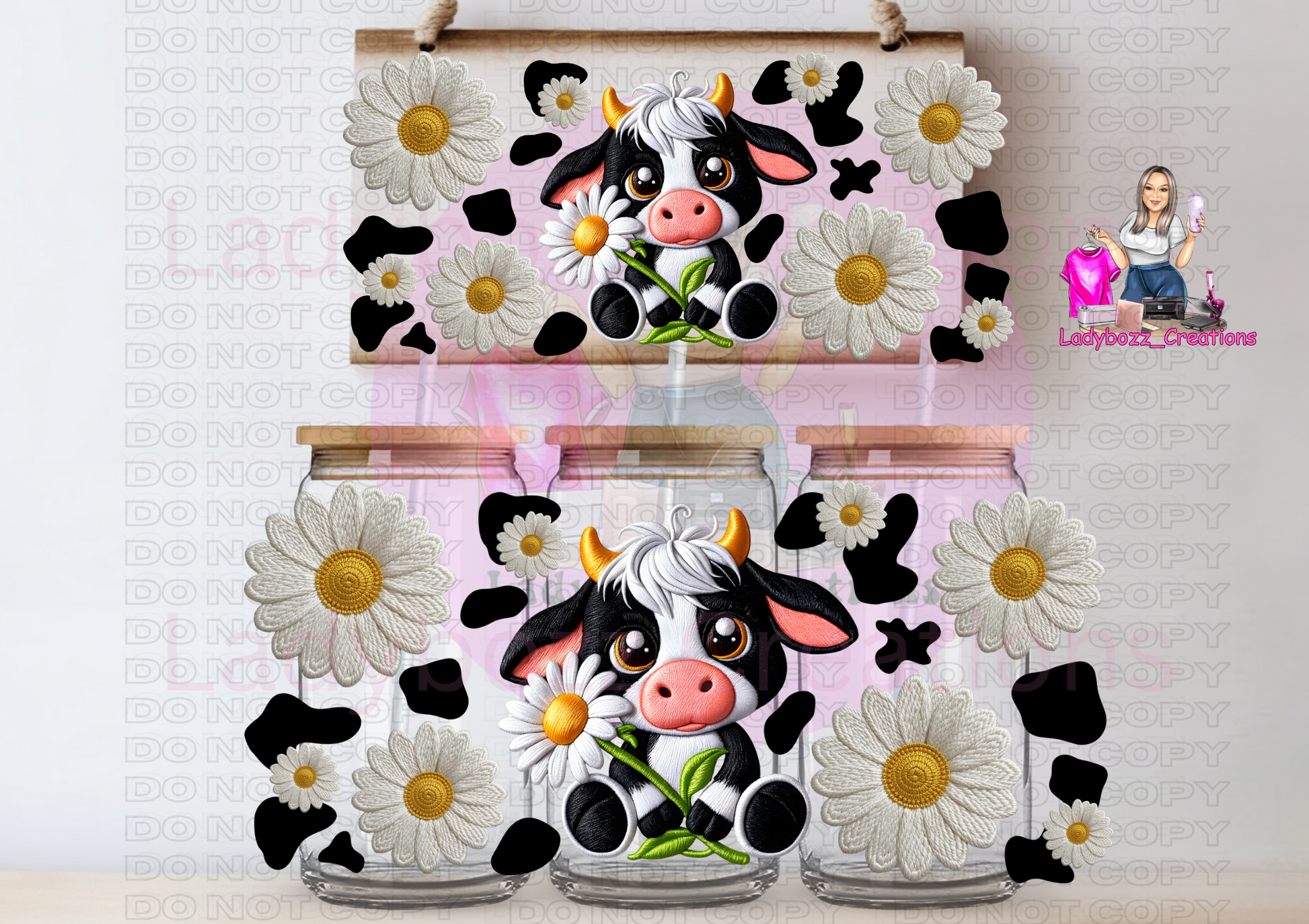 Highland Cow with Daisies Faux Embroidery/Libbey Cup or wrap only
